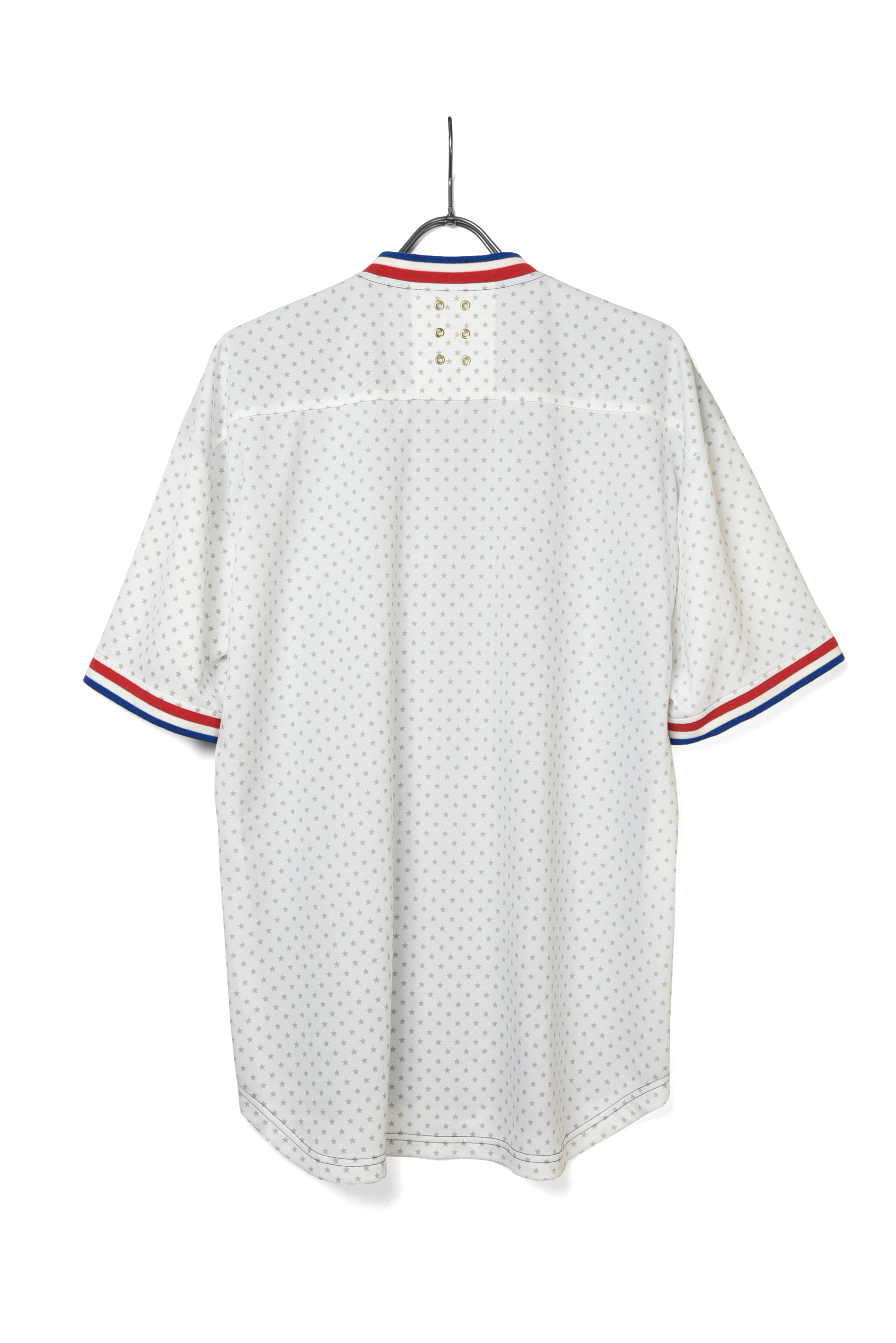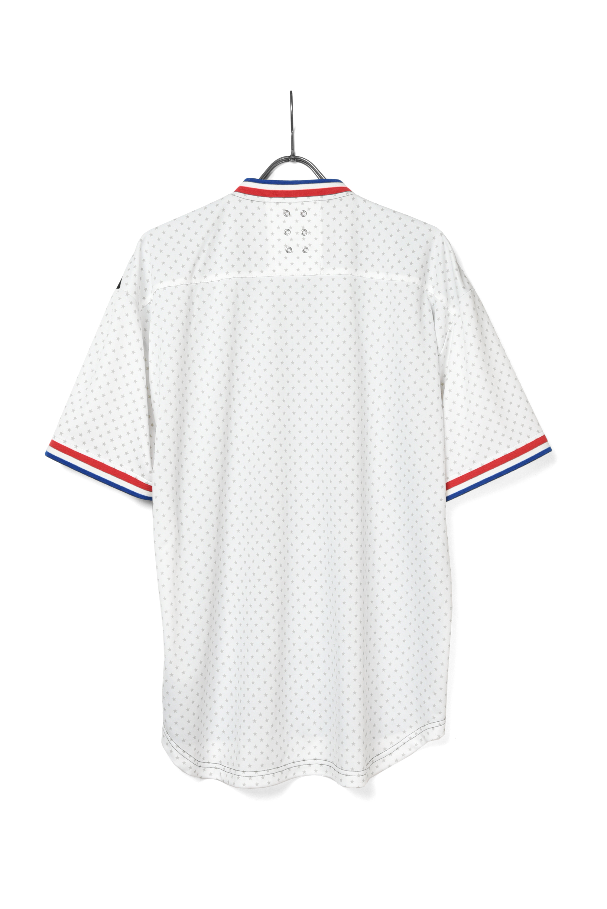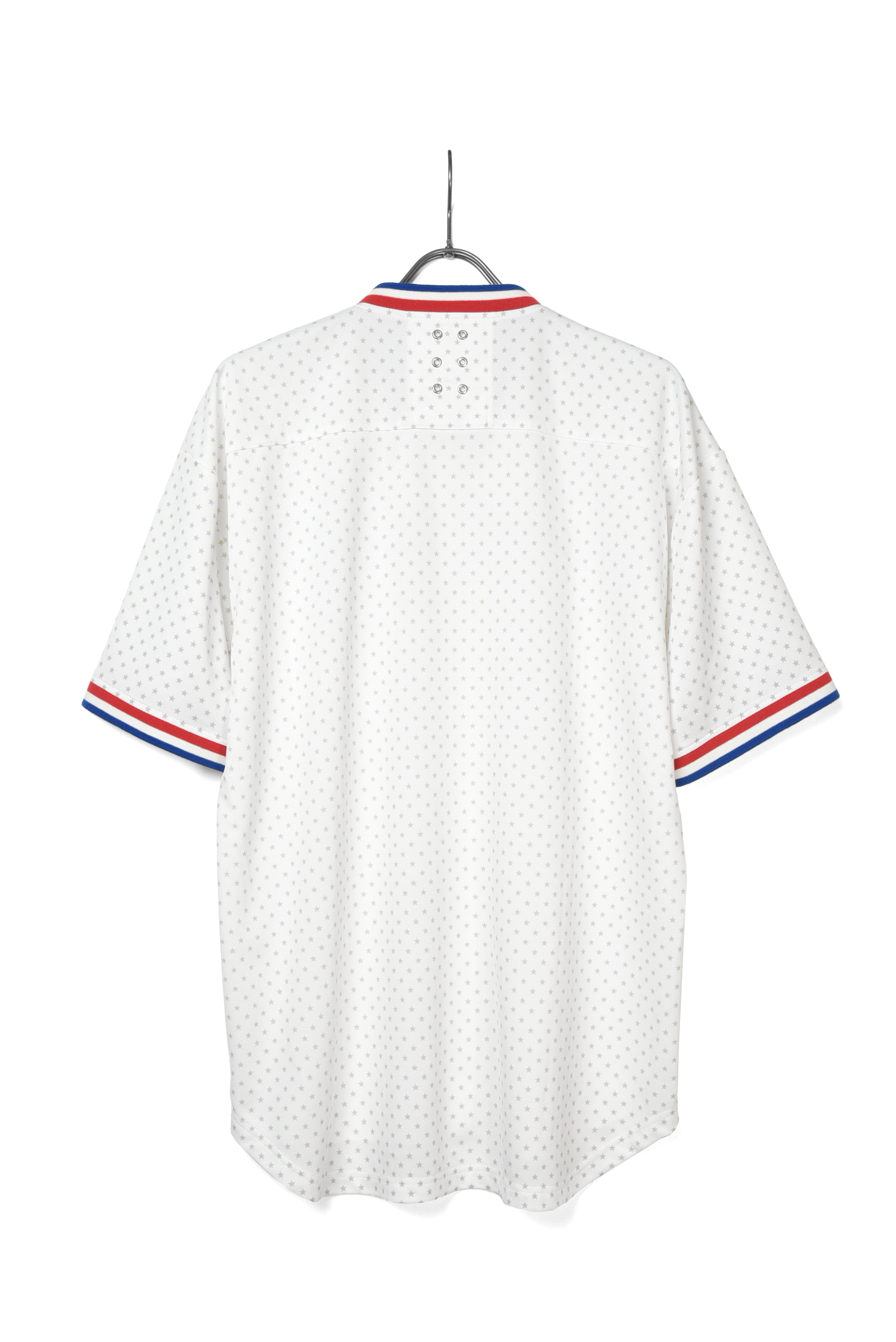 襟と、袖口にトリコロールカラーのリブをあしらったベースボールシャツをソースにデザインされたビッグシルエットオンプレイシャツです。