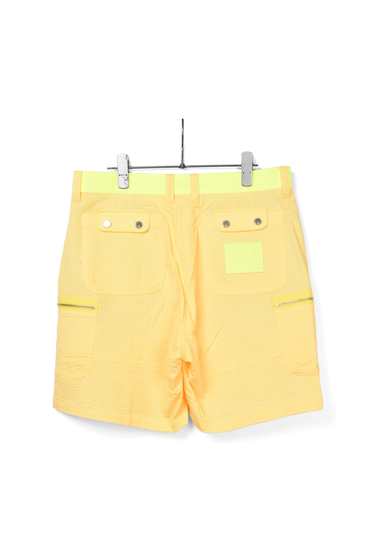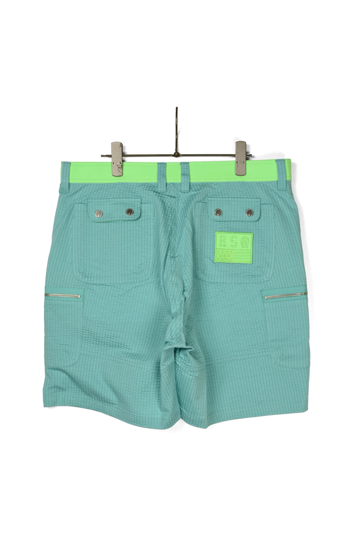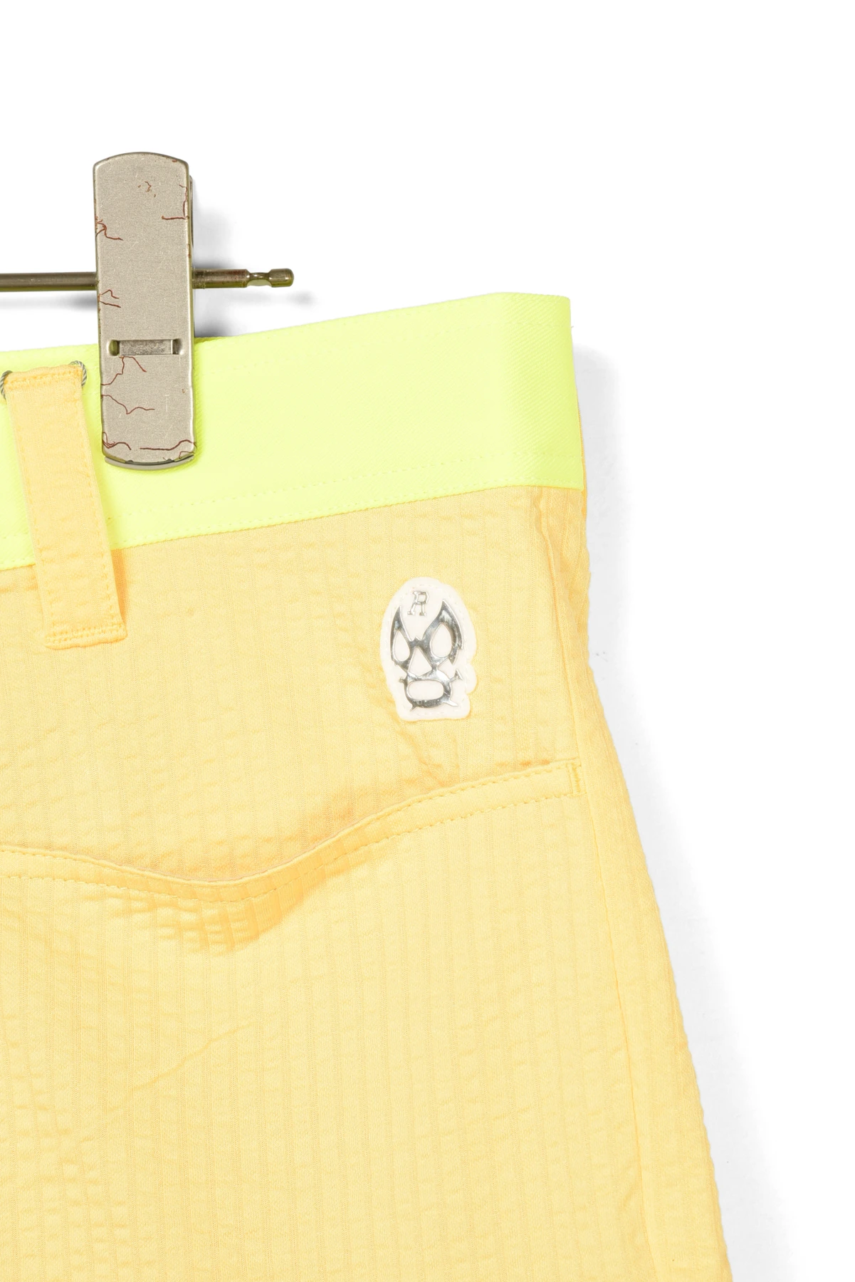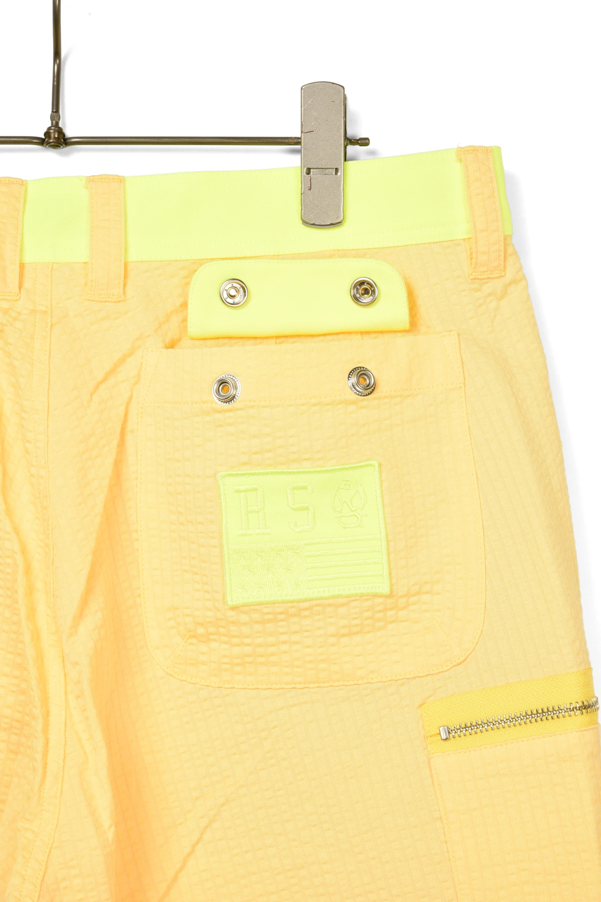 ウェストベルトと、バックポケットのワッペンにネオンカラー生地を使用しています。