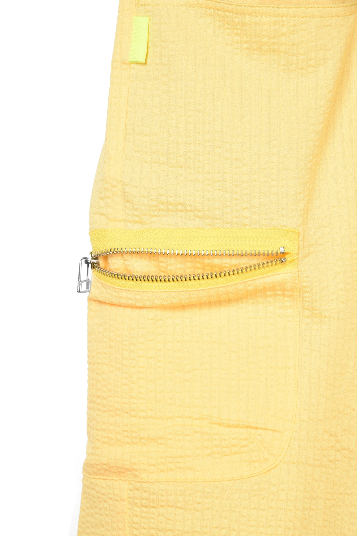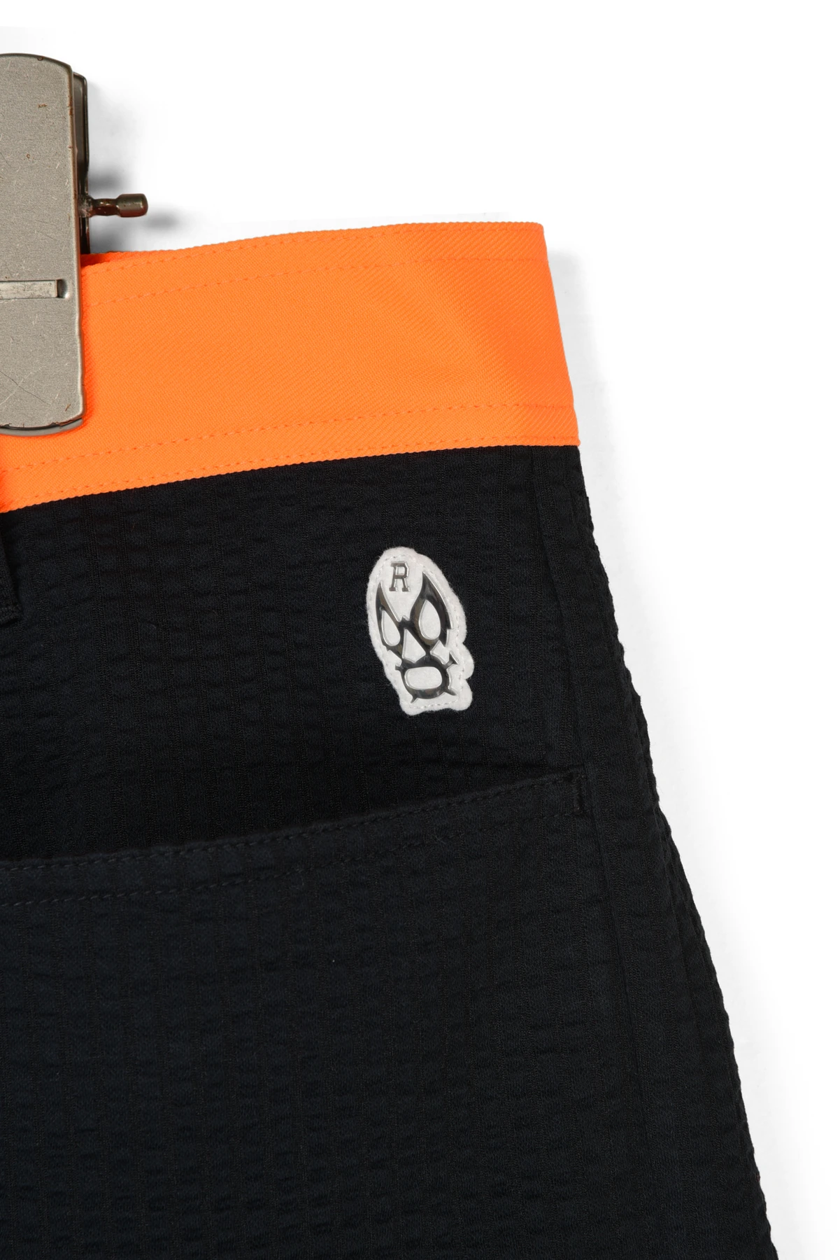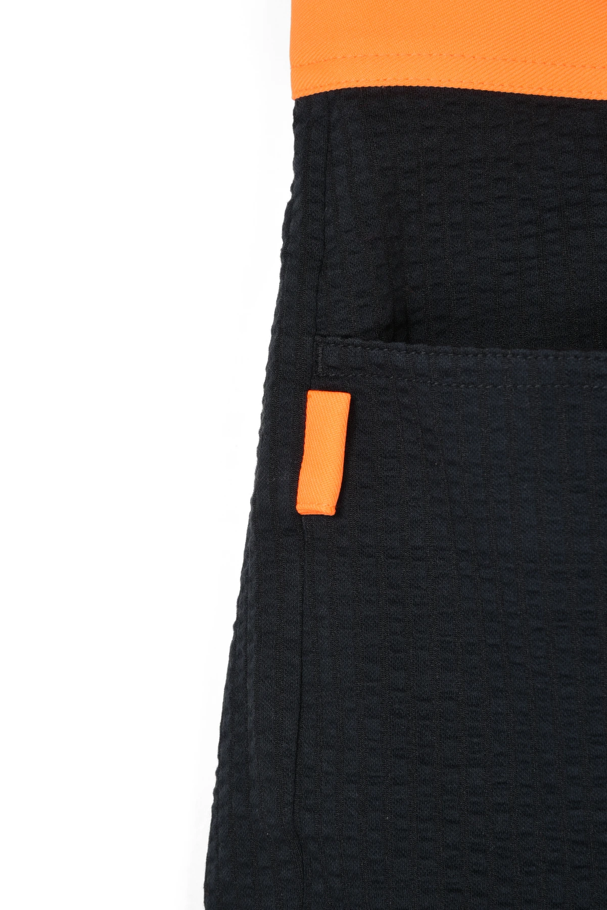 ウェストベルトと、バックポケットのワッペンにネオンカラー生地を使用しています。