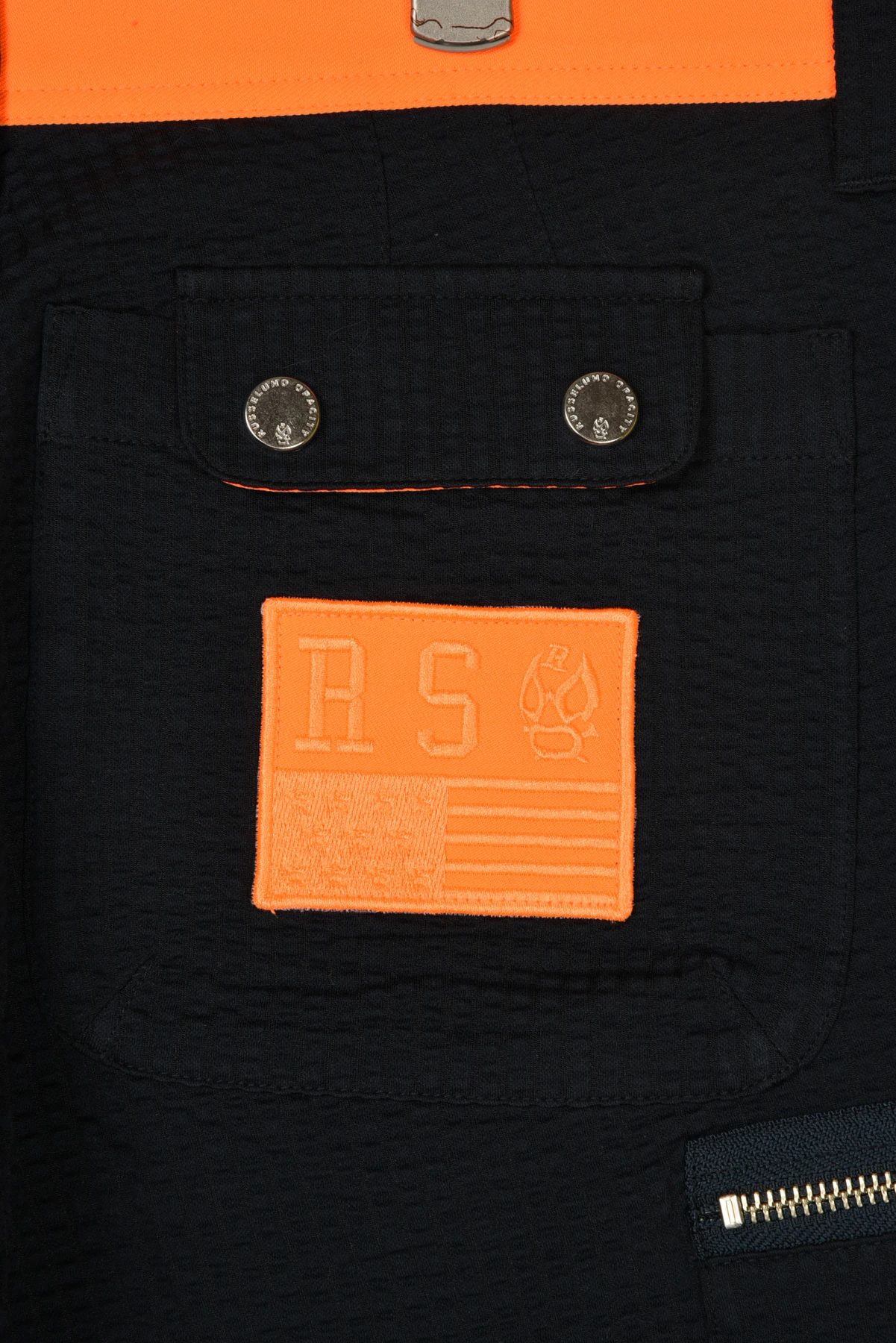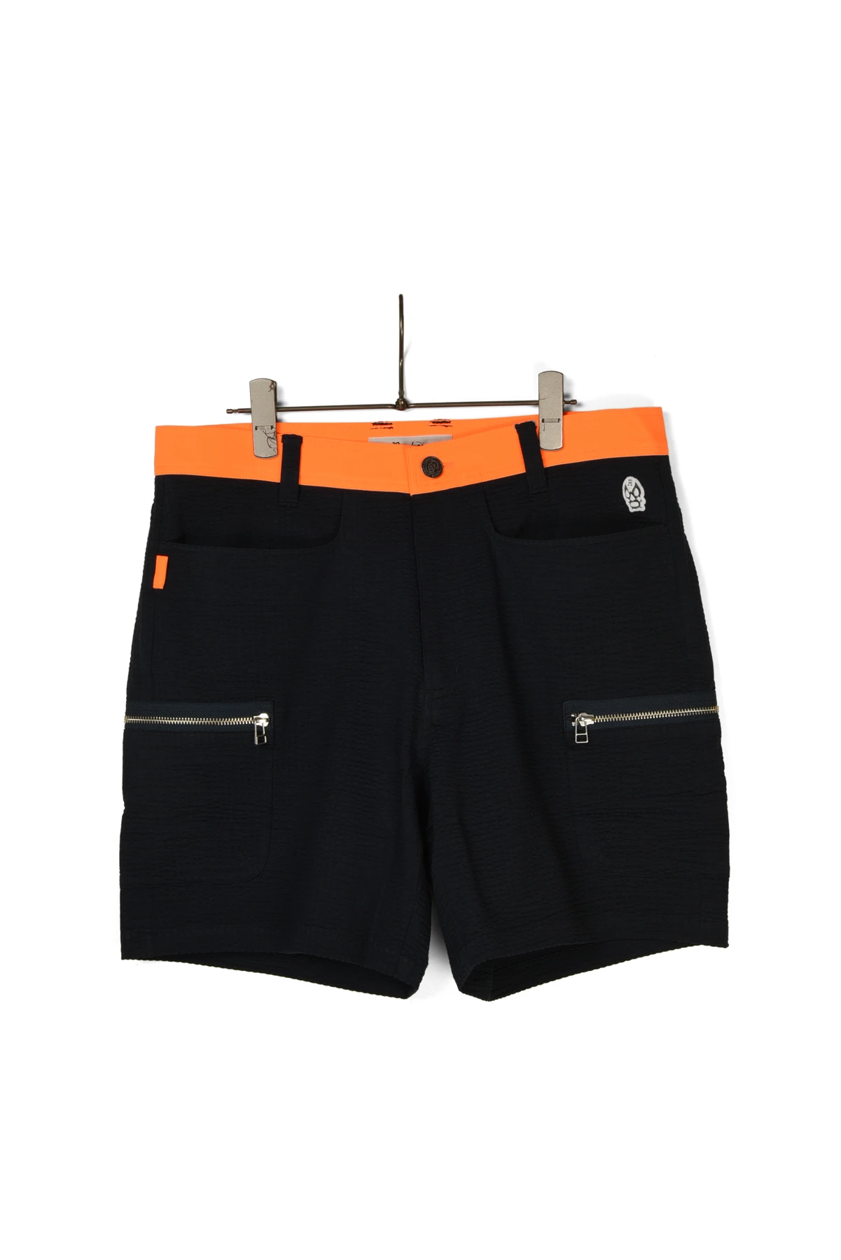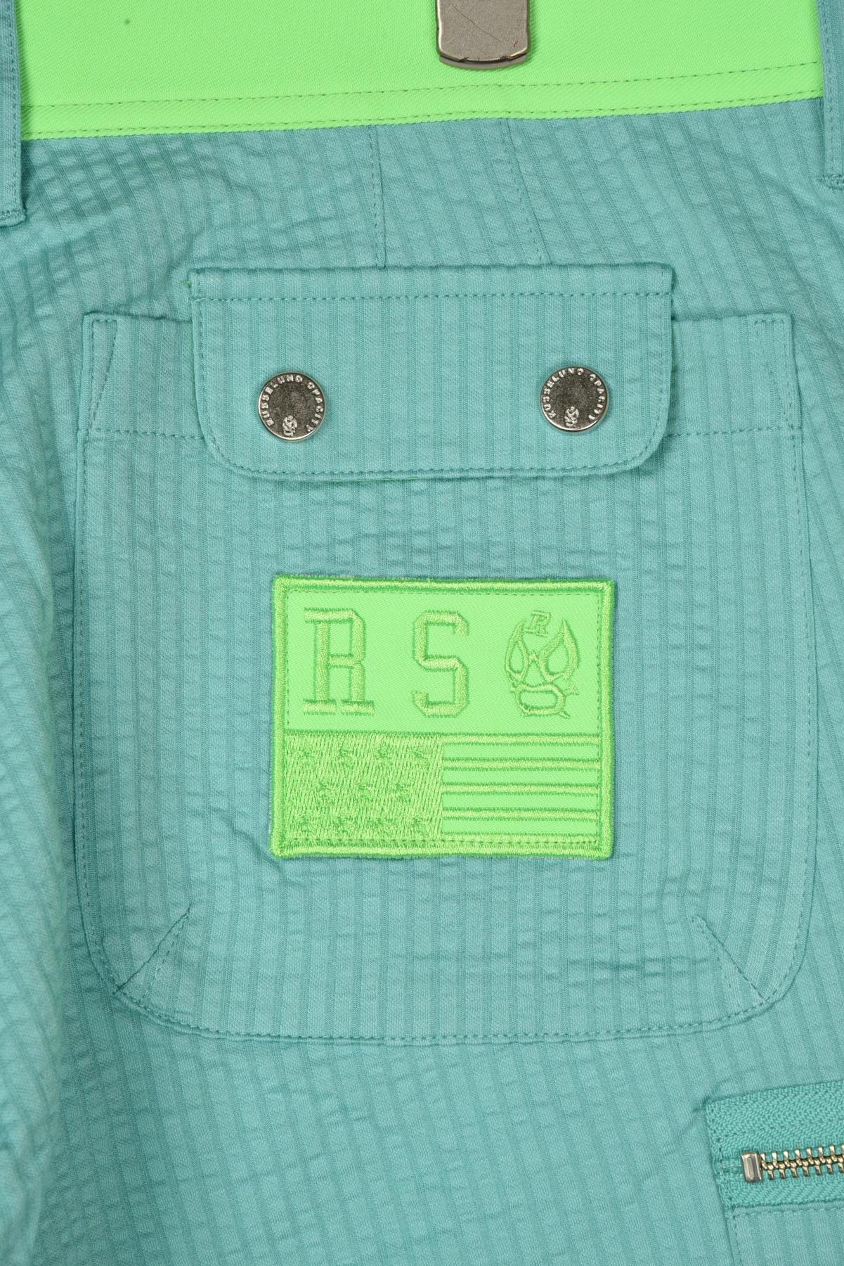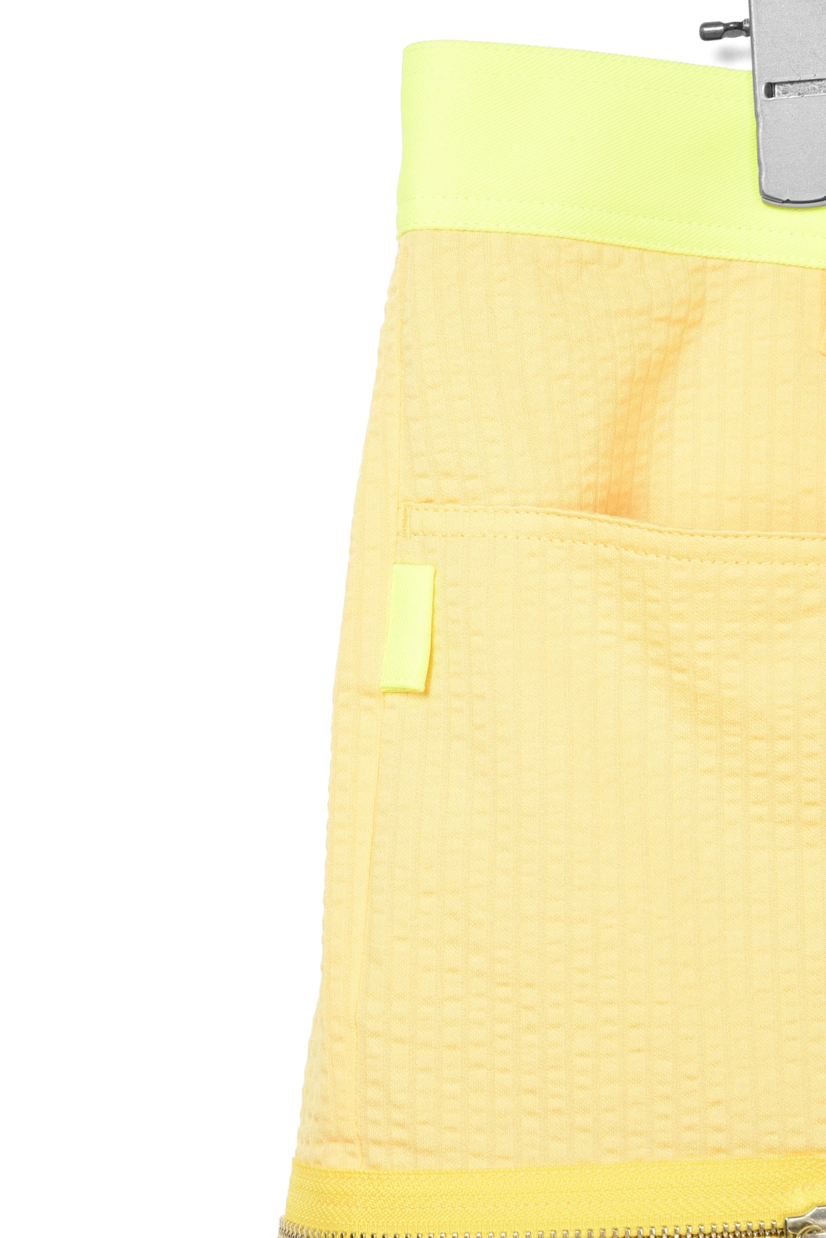 ウェストベルトと、バックポケットのワッペンにネオンカラー生地を使用しています。