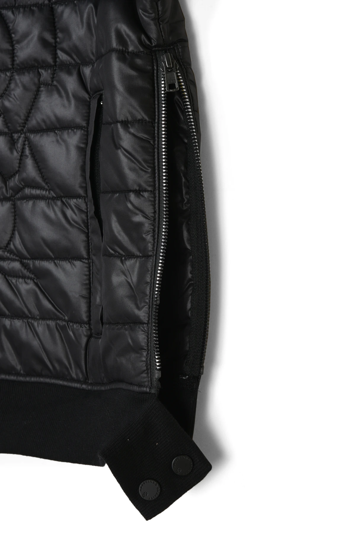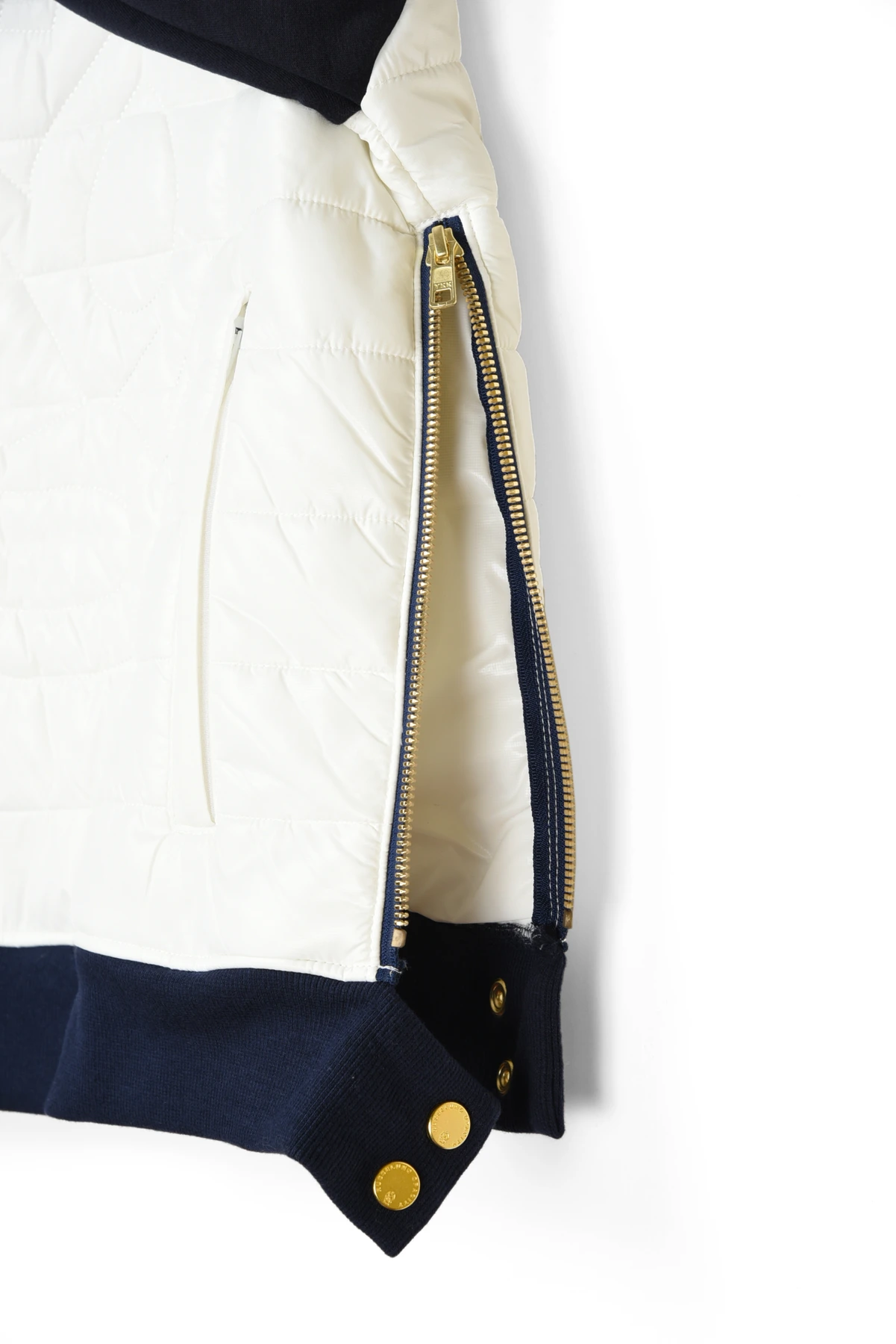 身頃には、ダウンライクな軽量中綿を使用し保温性を高め、袖部分には、表面がニットで、裏面は毛足の長いマイクロフリースになった伸縮性抜のダブルフェイス生地を使用しています。