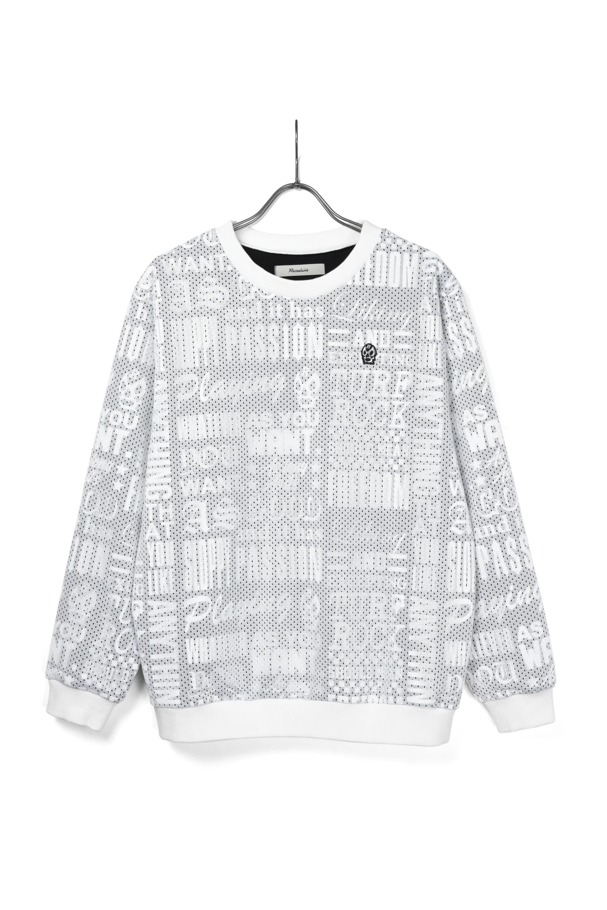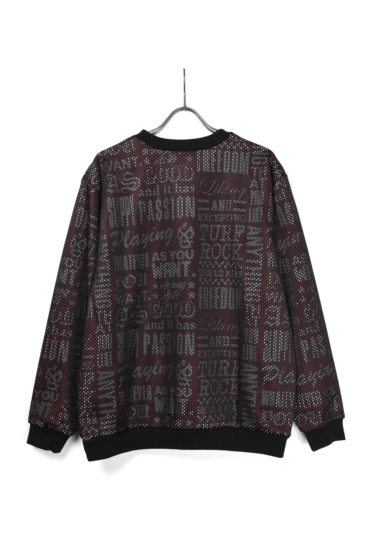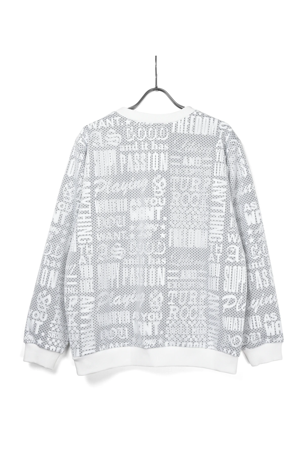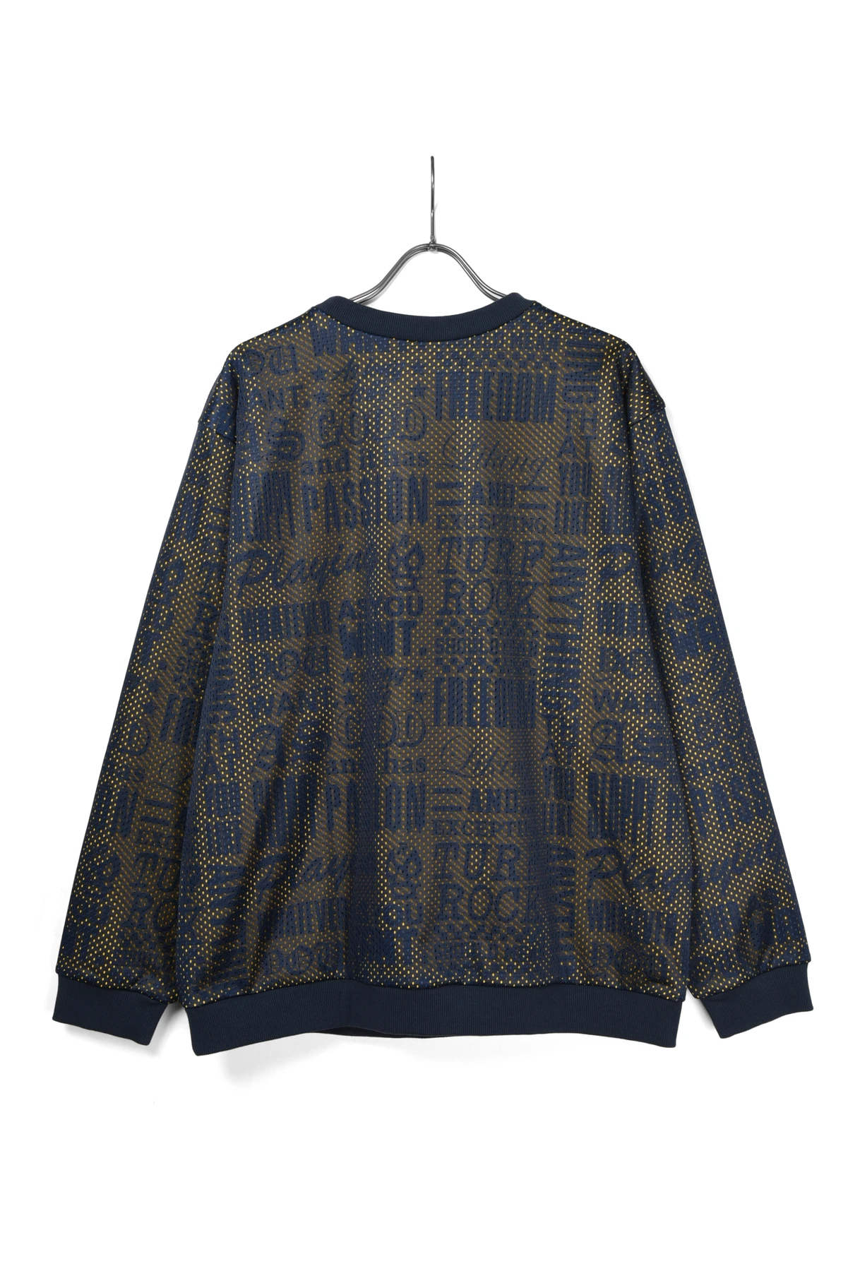 総柄プリントの入った裏毛スウェット生地と、メッシュ生地をレイヤードさせたクルーネックスウェットです。