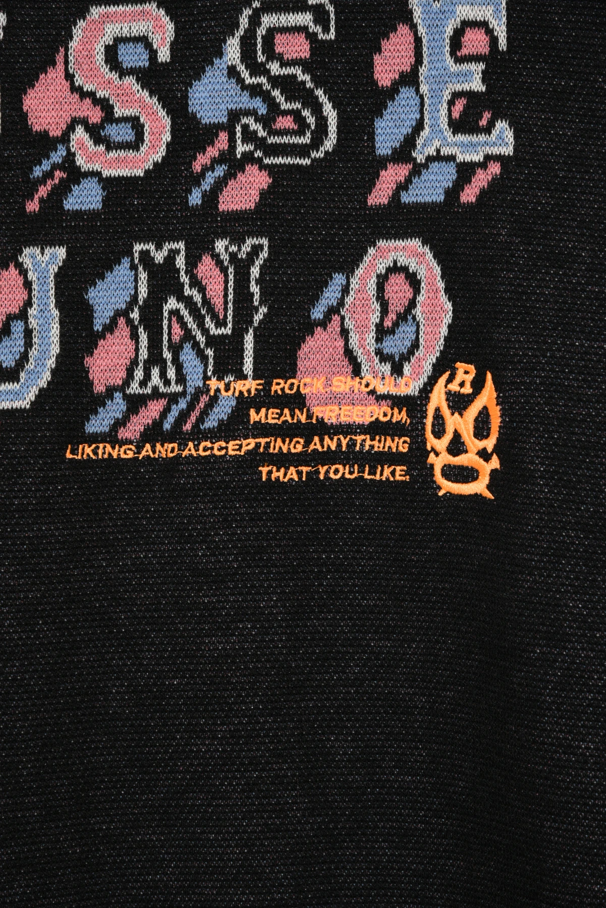 ジャガード編みロゴの上に、刺繍をかけたレイヤードデザインになっています。