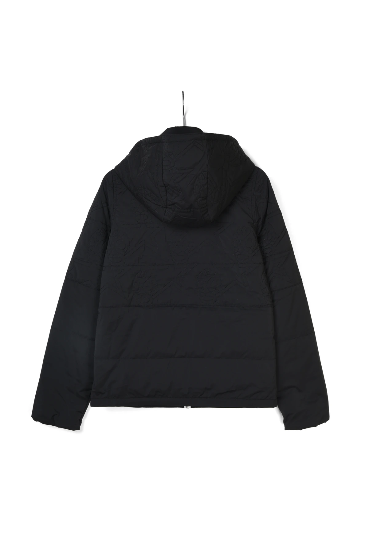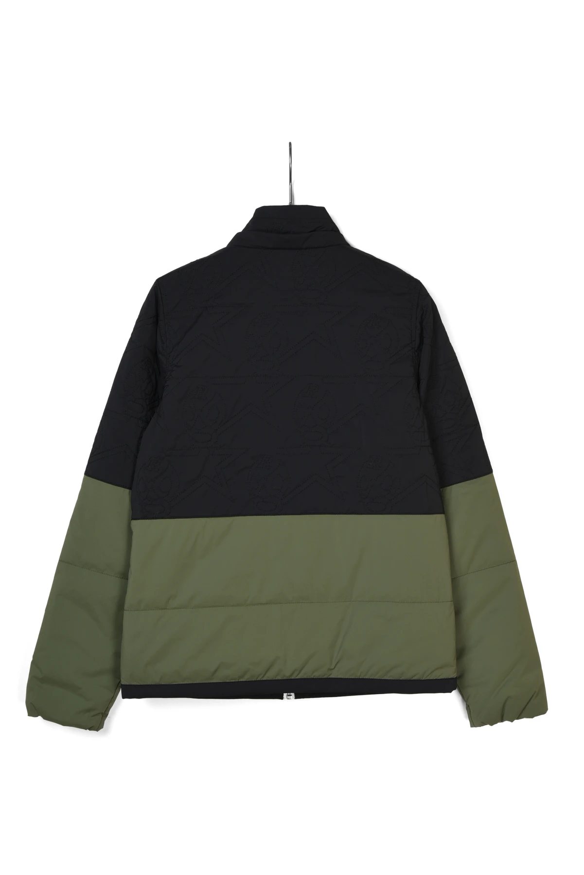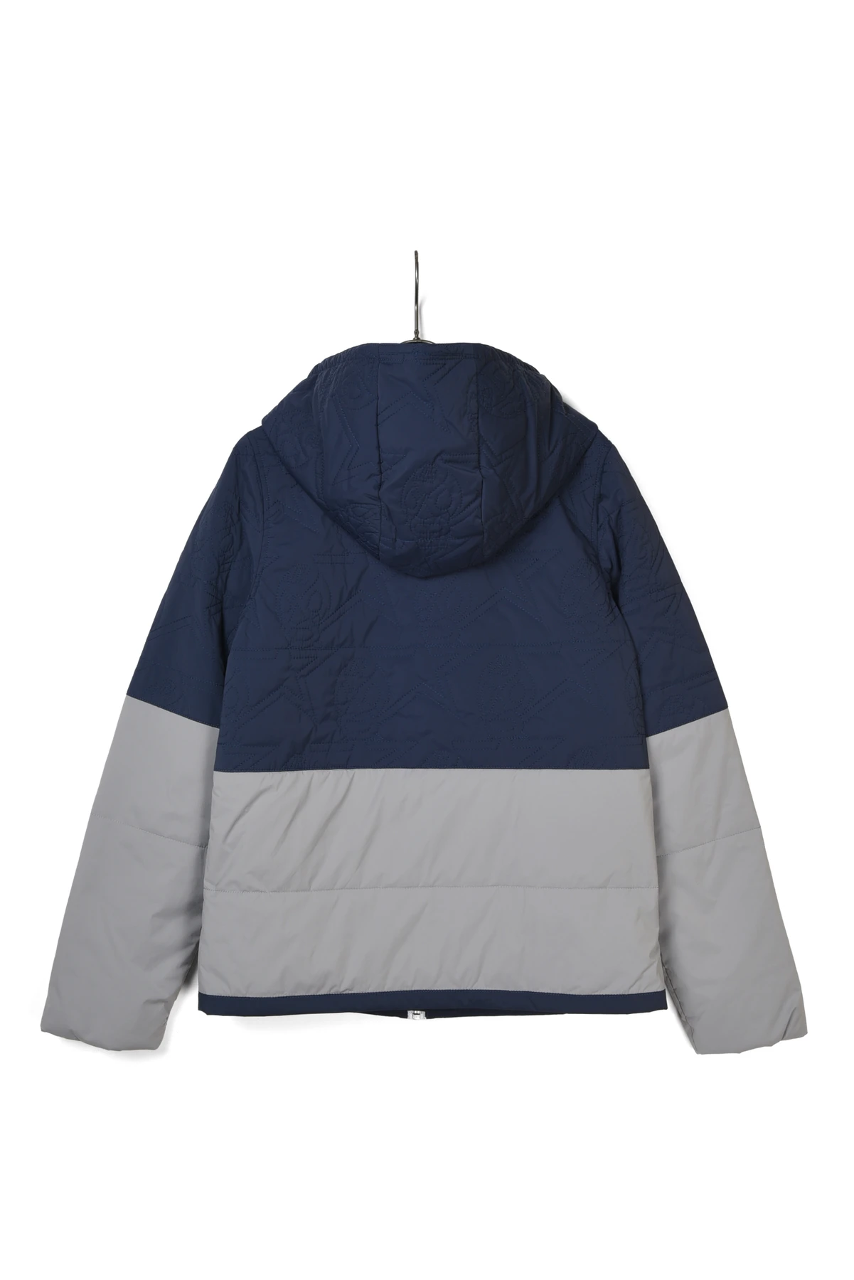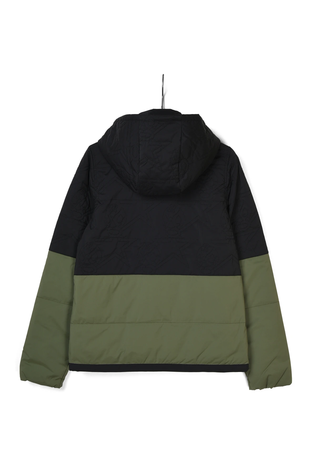 カラーブロック切り替えをアクセントにバックボディにルチャステッチをあしらった中綿フード付きブルゾン。