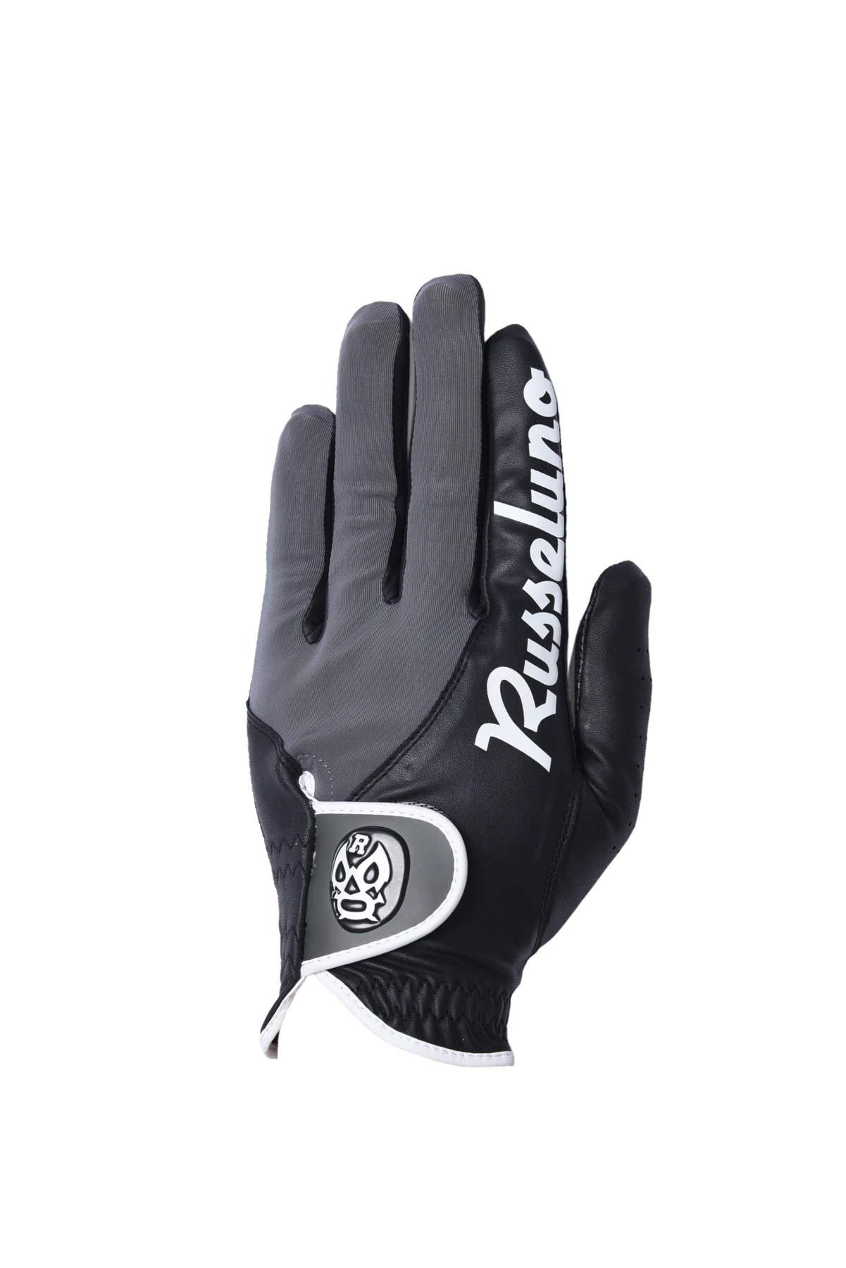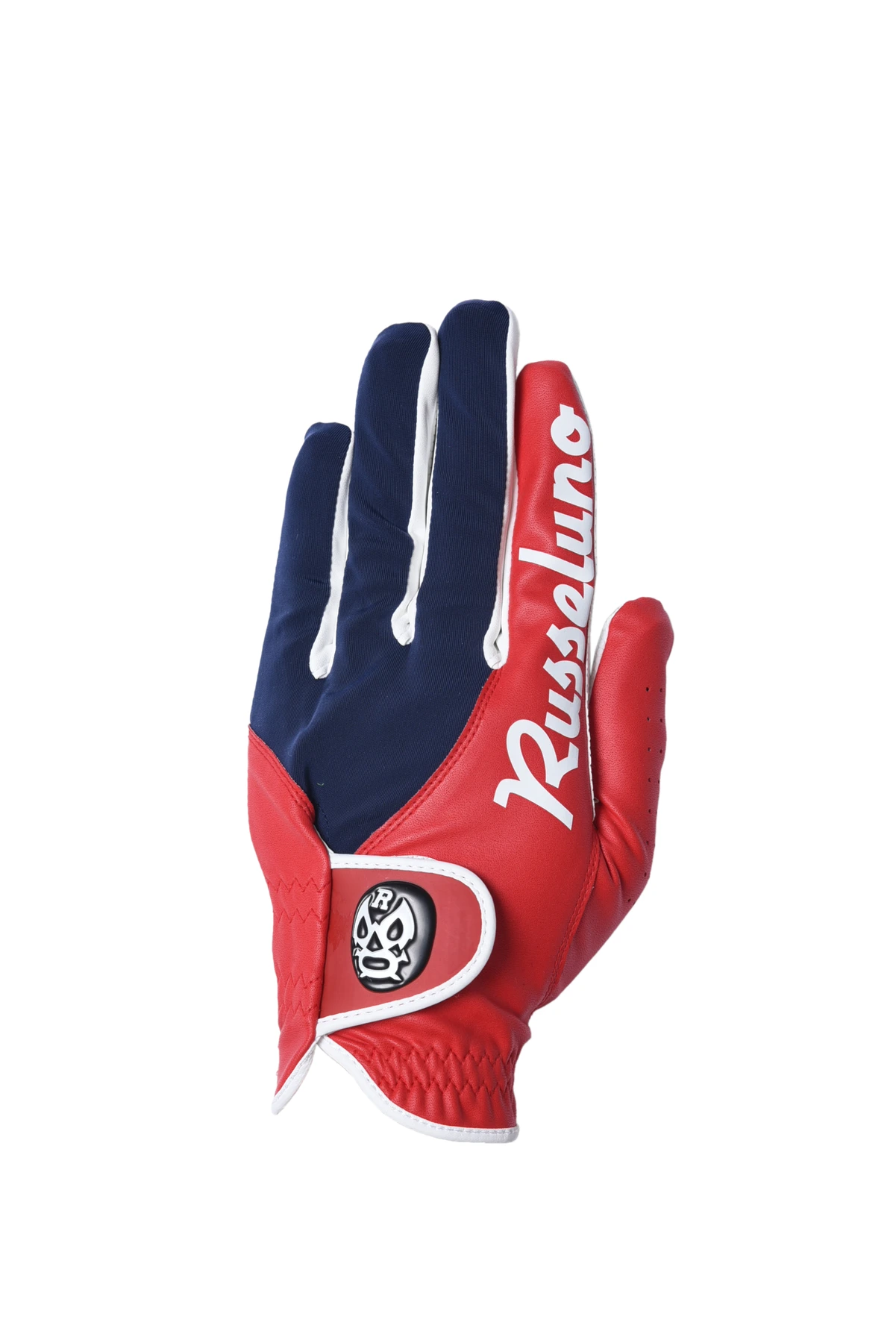 人差し指にRusselunoロゴが入ったグローブです。マジックテープの部分にLUCHAのPVCワッペンがつきます。合成皮革とポリエステルのコンビネーションで合わせやすく、主張もあるグローブです。