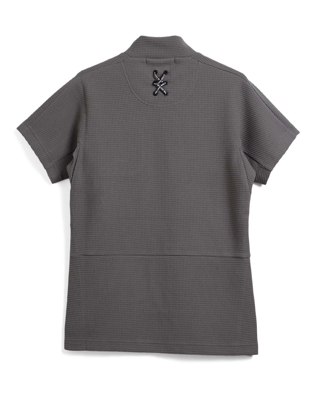 吸水速乾性に優れ、ポリエステル100%ながら綿ライクなワッフル素材を使用したモックネックシャツ。