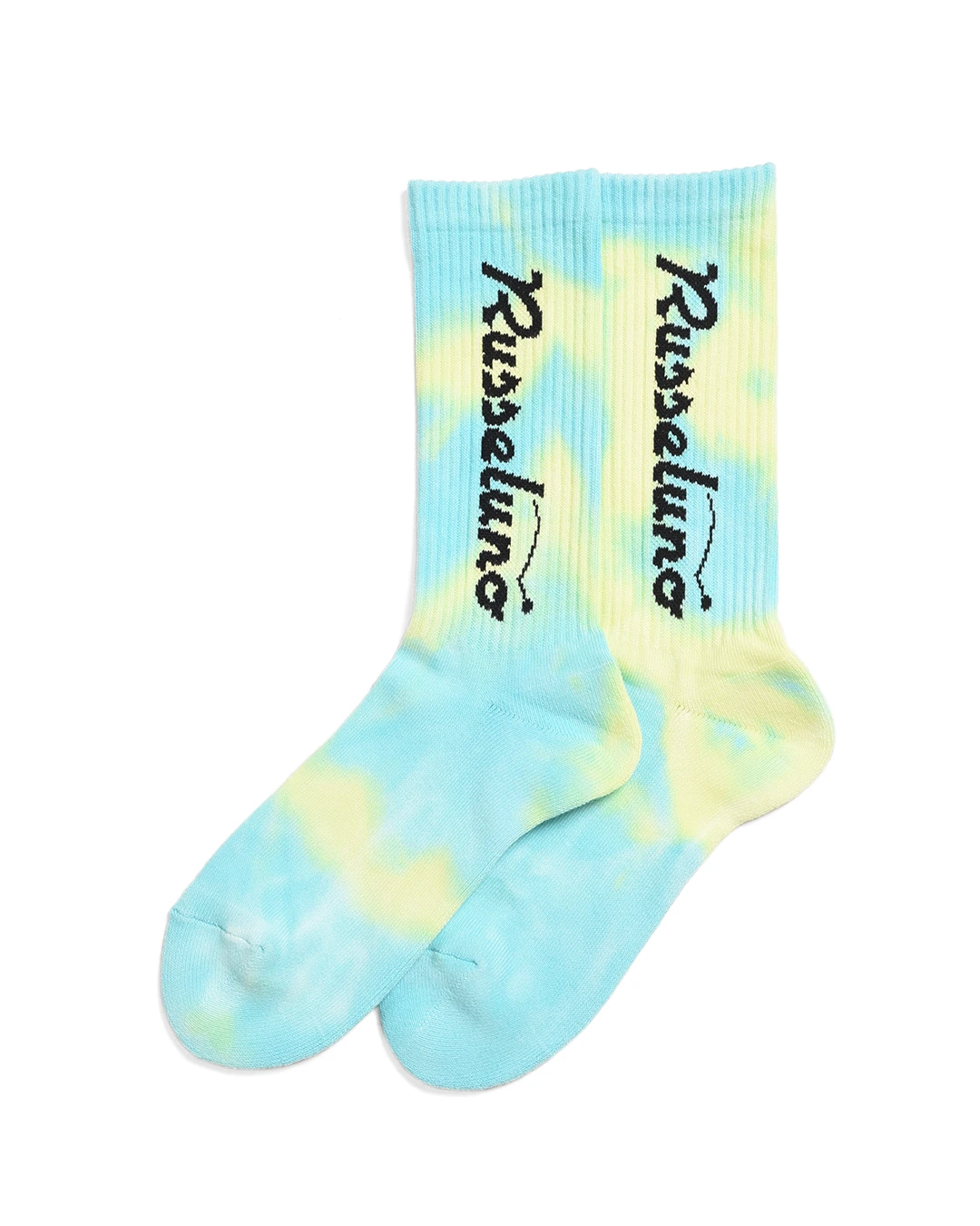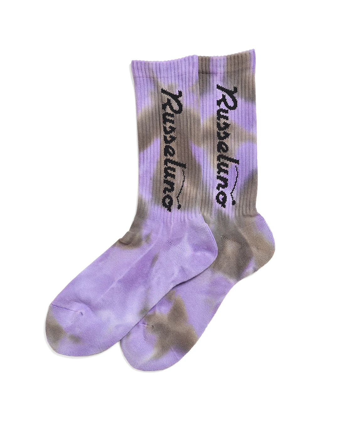Russelunoのロゴが両サイドに入った、ミドルカットのソックスです。タイダイ染めで1足ずつ染め上げ独特の雰囲