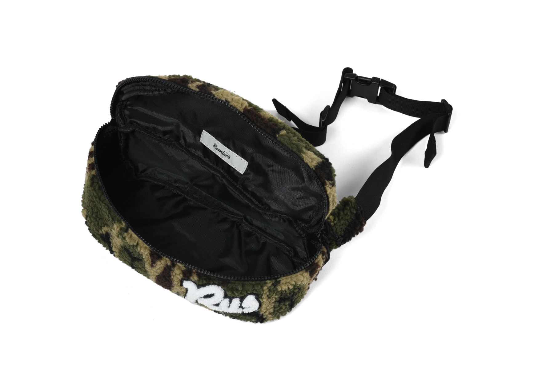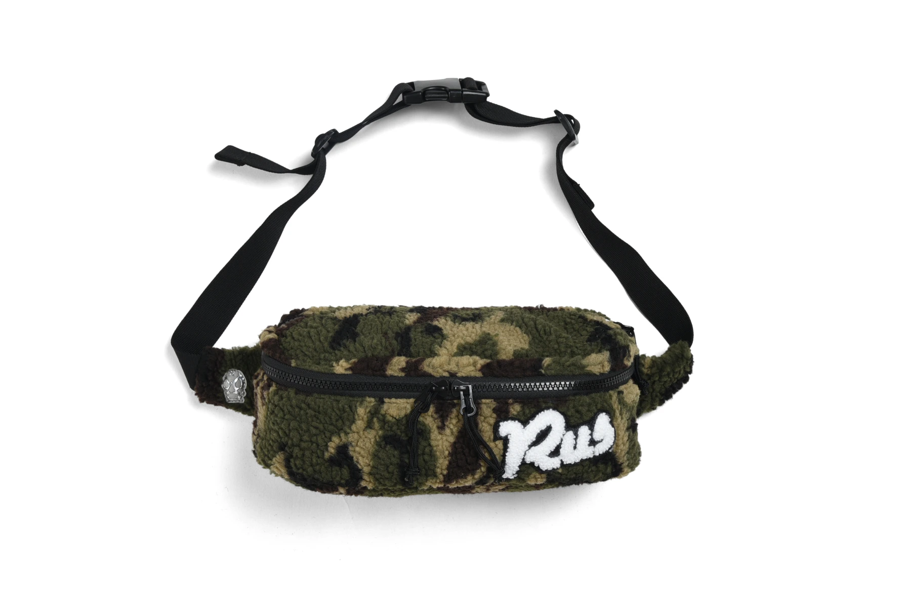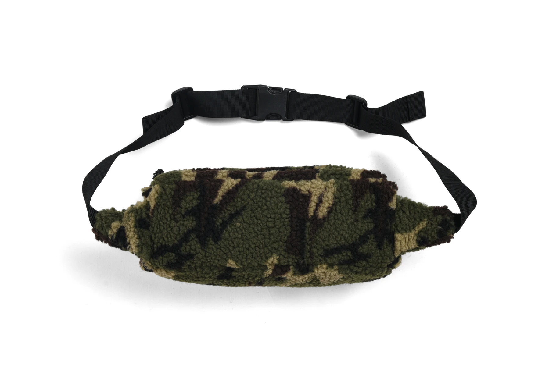 ボリュームのあるカモフラボアを使用したボディバッグ。